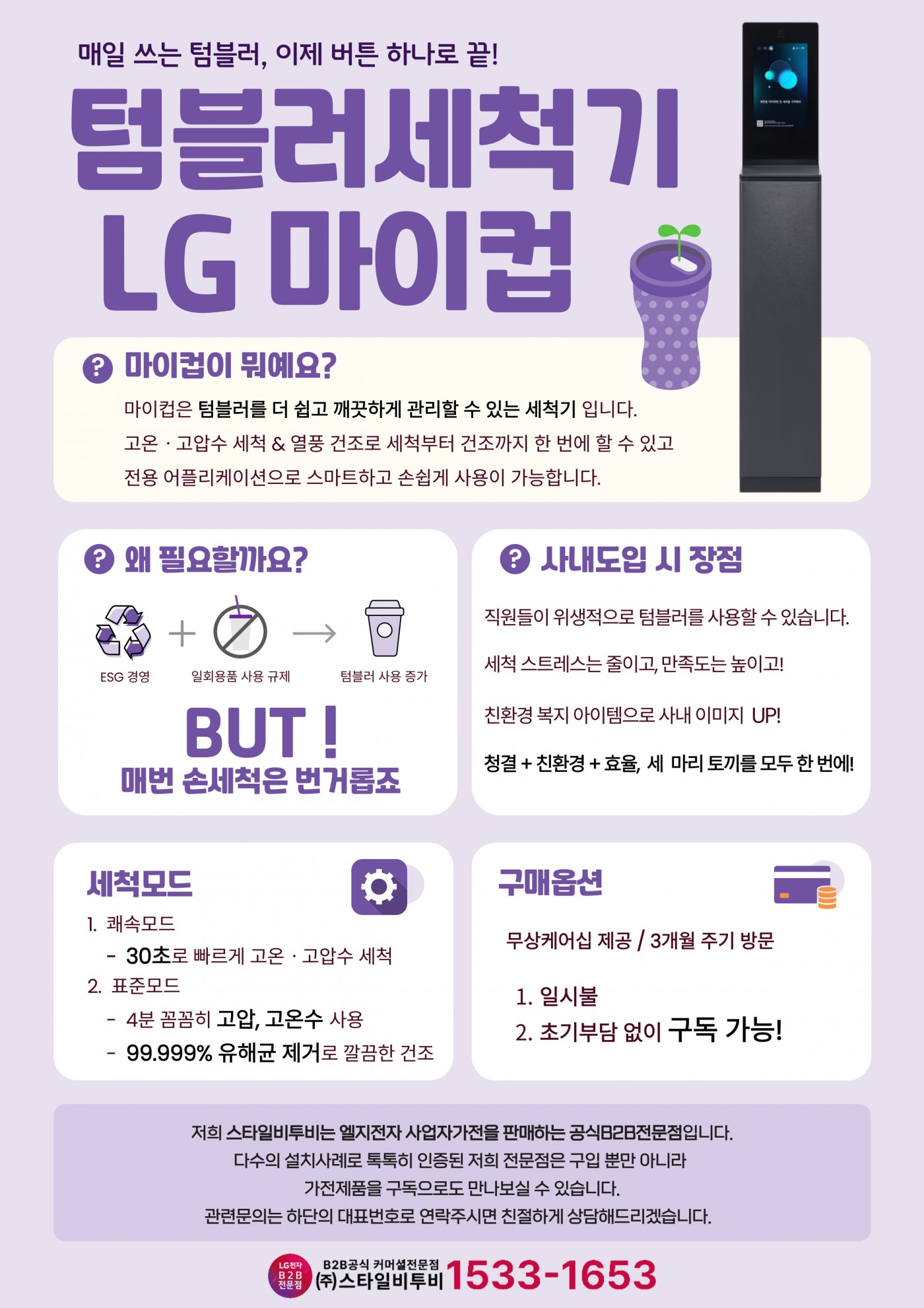 안녕하세요, 스타일비투비 입니다. 요즘 ESG경영과 친환경에 대한 관심도가 높아지면서 텀블러 사용이 늘어나고 있는데요. 자주 사용하는 만큼 매번 세척하기가 번거롭죠! 이럴 때 텀블러 세척기만 있으면 딱 해결됩니다.